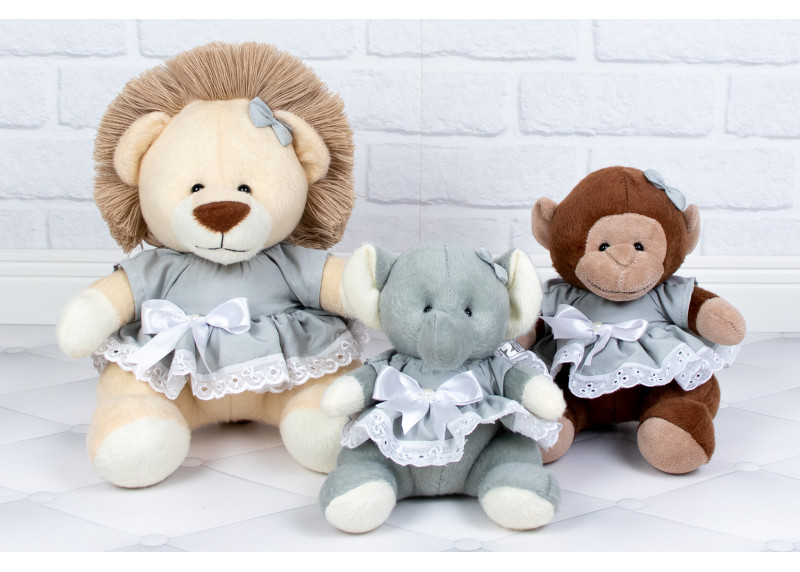 Trio Safári Provence Misto Leão 22 cm, Macaco 18 cm e Elefante 15 cm - Vestido com lese cinza liso
