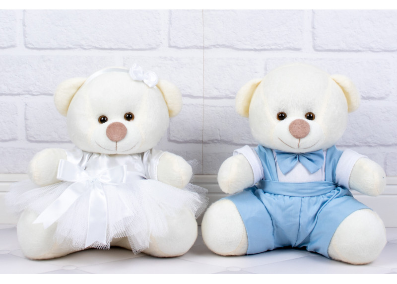 Casal Ursos Tedde Pajem Azul claro, Daminha Branca, padrão - Pelúcia Palha